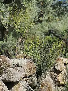 Les feuilles sont alternes, coriaces, linéaires-lancéolées, aiguës, entières, uninervées. Elles sont portées par des tiges vertes, à rameaux dressés et anguleux[4].
