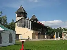 Dans le cadre de l'expansion de l'hippodrome Scheibenholz qui existe depuis 1867, la tribune de bois existante doit être remplacée. Burghardt conçoit un bâtiment massif de tribune avec deux tours massives et un restaurant.