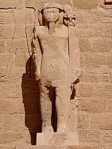 De l'autre côté du passage vers la cour intérieure, le même colosse tenait un étendard surmonté d'une tête de faucon. Selon Christiane Desroches Noblecourt, c'est Mérytamon, l'autre grande épouse royale, fille de Néfertari, qui devait figurer à ses côtés.
