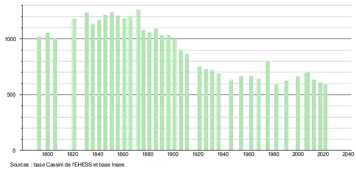 L'évolution du nombre d'habitants est connue à travers les recensements de la population effectués dans la commune depuis 1793. Pour les communes de moins de 10 000 habitants, une enquête de recensement portant sur toute la population est réalisée tous les cinq ans, les populations légales des années intermédiaires étant quant à elles estimées par interpolation ou extrapolation[19]. Pour la commune, le premier recensement exhaustif entrant dans le cadre du nouveau dispositif a été réalisé en 2007[20].