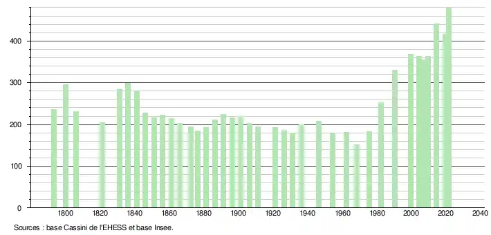 L'évolution du nombre d'habitants est connue à travers les recensements de la population effectués dans la commune depuis 1793. Pour les communes de moins de 10 000 habitants, une enquête de recensement portant sur toute la population est réalisée tous les cinq ans, les populations légales des années intermédiaires étant quant à elles estimées par interpolation ou extrapolation[21]. Pour la commune, le premier recensement exhaustif entrant dans le cadre du nouveau dispositif a été réalisé en 2004[22].