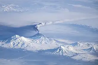 Le groupe volcanique du Klioutchevskoï vu depuis l'ISS. De gauche à droite : l'Ouchkovski, le Klioutchevskoï (en éruption), le Bezymianny, le Tolbatchik, le Zimina et l'Oudina.