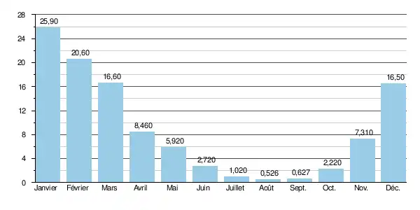 D'autre part les crues peuvent être fort importantes, aggravées comme dans l'ensemble du bassin de la Mayenne, par l'imperméabilité des sols. En effet, les QIX 2 et QIX 5 valent respectivement 110 et 180 m3/s. Le QIX 10 est de 230 m3/s, tandis que le QIX 20 ou débit instantané calculé pour une crue vicennale, est de 270 m3/s. Quant au QIX 50, il n'a pas encore été calculé, la période d'observation étant trop courte. Le QIX 20 vaut bien plus du tiers de celui de la Mayenne (720 m3/s).