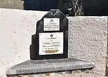 D'argent au mont de sinople sommé de deux chèvres affrontées de sable, au chef de gueules chargé d'une croisette du champ accostée de deux étoiles du même.