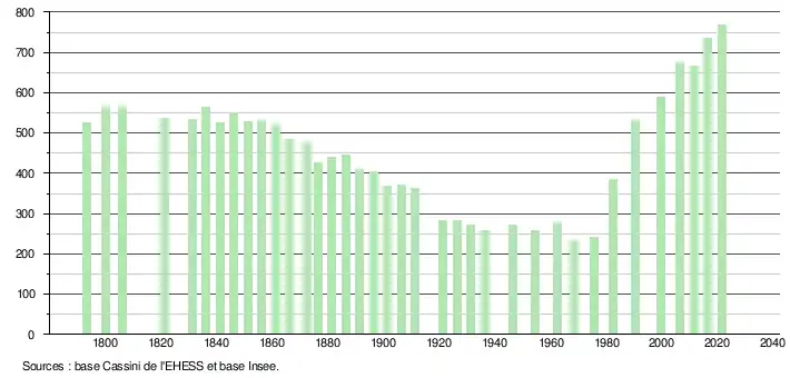 L'évolution du nombre d'habitants est connue à travers les recensements de la population effectués dans la commune depuis 1793. Pour les communes de moins de 10 000 habitants, une enquête de recensement portant sur toute la population est réalisée tous les cinq ans, les populations légales des années intermédiaires étant quant à elles estimées par interpolation ou extrapolation[25]. Pour la commune, le premier recensement exhaustif entrant dans le cadre du nouveau dispositif a été réalisé en 2006[26].