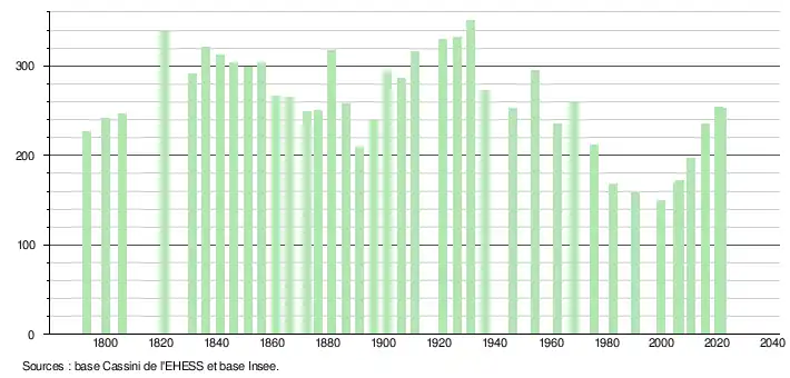L'évolution du nombre d'habitants est connue à travers les recensements de la population effectués dans la commune depuis 1793. Pour les communes de moins de 10 000 habitants, une enquête de recensement portant sur toute la population est réalisée tous les cinq ans, les populations légales des années intermédiaires étant quant à elles estimées par interpolation ou extrapolation[18]. Pour la commune, le premier recensement exhaustif entrant dans le cadre du nouveau dispositif a été réalisé en 2005[19].