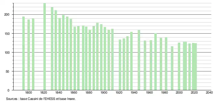 L'évolution du nombre d'habitants est connue à travers les recensements de la population effectués dans la commune depuis 1793. Pour les communes de moins de 10 000 habitants, une enquête de recensement portant sur toute la population est réalisée tous les cinq ans, les populations légales des années intermédiaires étant quant à elles estimées par interpolation ou extrapolation[22]. Pour la commune, le premier recensement exhaustif entrant dans le cadre du nouveau dispositif a été réalisé en 2008[23].