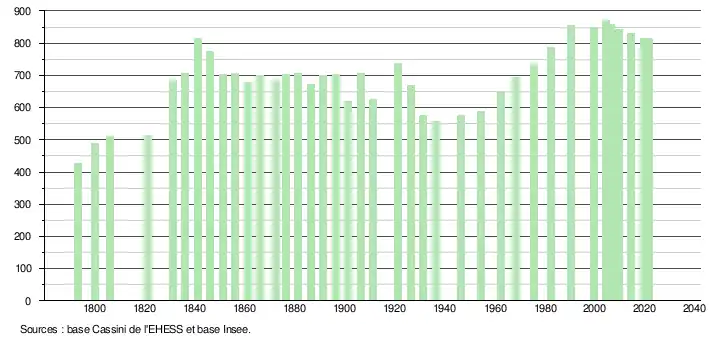 L'évolution du nombre d'habitants est connue à travers les recensements de la population effectués dans la commune depuis 1793. Pour les communes de moins de 10 000 habitants, une enquête de recensement portant sur toute la population est réalisée tous les cinq ans, les populations légales des années intermédiaires étant quant à elles estimées par interpolation ou extrapolation[23]. Pour la commune, le premier recensement exhaustif entrant dans le cadre du nouveau dispositif a été réalisé en 2004[24].