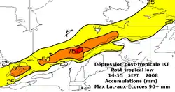 La dépression qu’était devenue Ike est passé le long des Grands Lacs Érié et Ontario le , avant de longer la vallée du Saint-Laurent au Québec et de s’éloigner vers l’océan Atlantique au niveau de la mer du Labrador le 15. Elle a copieusement arrosé une bande de quelques centaines de kilomètres de large au nord de cette trajectoire, laissant des accumulations de pluie variant de 40 à 98 mm. Ces quantités s’ajoutèrent à celles d’une autre dépression ayant passé la veille.