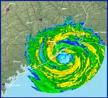 Les pannes électriques dans l’est du Texas ont commencé avant 20 h le , avec la bordure externe du système[86]. Entre 2,8 et 4,5 millions de personnes ont été plongées dans le noir[99],[100]. L’œil de l’ouragan est ensuite passé à Houston, les fenêtres de plusieurs gratte-ciels du centre-ville ont volé en éclats sous la force des vents, dont celles de la tour de 75 étages de JP Morgan Chase (tour JP Morgan Chase), les fils électriques ont été arrachés et le stade de football Reliant a été endommagé, forçant la remise du match entre les Texans de Houston et les Ravens de Baltimore qui devait avoir lieu le [89],[101]. Les bris électriques étaient tellement généralisés que le service ne devait reprendre dans certains secteurs de la ville que le . Heureusement, le passage rapide de la tempête n’a pas permis à l’onde tempête d’aller très loin dans les terres et les inondations ont été minimales dans la ville[89].