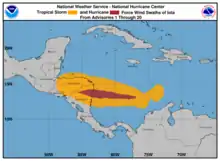 Le NHC a commencé à suivre un développement tropical sur les modèles de prévision numérique du temps dans la mer des Caraïbes dès le [3]. Le 10, une onde tropicale est apparue sur les Petites Antilles et sa probabilité de former ce nouveau cyclone a augmenté rapidement en entrant sur les eaux chaudes de la mer. Le au matin, l'onde était au milieu de la mer des Caraïbes et la probabilité était rendue à plus de 80 %[4].