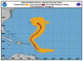 L’ouragan Tammy est le 20e système tropical, mais seulement le 19e nommé, et le 7e ouragan de la saison 2023 dans l'océan Atlantique nord[N 1]. Il provient d'une onde tropicale qui a émergé au large de l'Afrique de l'ouest au sud des îles du Cap-Vert le . Traversant l'Atlantique tropical, elle est devenue une tempête tropicale au large des Petites Antilles le . Le système a persisté, grâce à la température très chaudes de la mer malgré des conditions plus ou moins défavorables de cisaillement des vents, et est devenu un ouragan de catégorie 1 dans l'échelle de Saffir-Simpson le au nord-est de la Barbade. Longeant ensuite lentement l'arc antillais, il a touché La Désirade et Barbuda le lendemain. L'ouragan s'est ensuite éloigné des îles du Vent, se dirigeant d'abord vers le nord-ouest puis le nord et le nord-est, atteignant brièvement la catégorie 2 de l'échelle de Saffir-Simpson avant de devenir post-tropical loin au large des Bermudes.