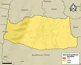 Le retrait-gonflement des sols argileux est susceptible d'engendrer des dommages importants aux bâtiments en cas d’alternance de périodes de sécheresse et de pluie. La totalité de la commune est en aléa moyen ou fort (44,5 % au niveau départemental et 48,5 % au niveau national). Sur les 524 bâtiments dénombrés sur la commune en 2019, 524 sont en aléa moyen ou fort, soit 100 %, à comparer aux 75 % au niveau départemental et 54 % au niveau national. Une cartographie de l'exposition du territoire national au retrait gonflement des sols argileux est disponible sur le site du BRGM[26],[Carte 3].