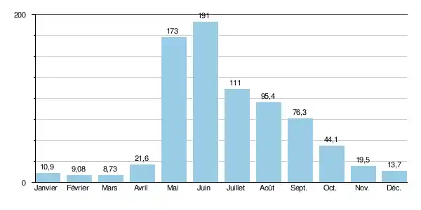Le débit moyen mensuel observé en mars (minimum d'étiage) est de 8,73 m3/s, soit plus ou moins 4,5 % du débit moyen du mois de mai, maximum de l'année (191 m3/s), ce qui montre l'amplitude assez importante des variations saisonnières. Et ces écarts peuvent être plus importants encore d'après les années : ainsi sur la durée d'observation de 45 ans, le débit mensuel minimal a été de 4,80 m3/s en , tandis que le débit mensuel maximal s'élevait à 463 m3/s en .