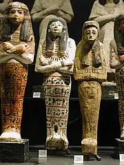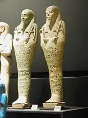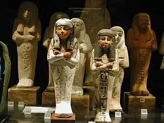 Ces statuettes représentent les serviteurs funéraires qui devaient répondre[note 1] à l’appel d’Osiris et remplacer le mort dans les travaux des champs de l’au-delà.