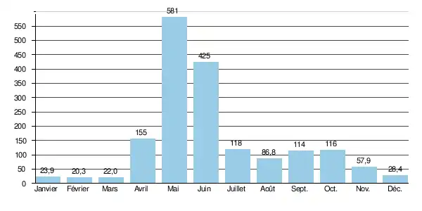 Les hautes eaux se déroulent au printemps, de la seconde quinzaine du mois d'avril au mois de juin inclus, ce qui correspond au dégel et à la fonte des neiges du bassin. Dès le mois de juillet, le débit baisse fortement, mais reste fort soutenu tout au long du reste de l'été et de l'automne. Un rebond de faible ampleur a lieu aux mois de septembre et d'octobre, et est lié aux précipitations automnales ainsi qu'à la moindre évaporation en cette saison. Au mois de novembre, le débit de la rivière plonge à nouveau, ce qui mène à la période des basses eaux. Celle-ci a lieu de novembre à mars inclus.