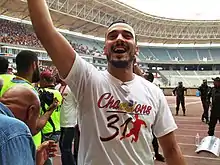 Oussema Boughanmi fêtant le 31e titre de champion de Tunisie avec les supporters de l'Espérance sportive de Tunis, au stade olympique de Radès le 18 mai 2017.