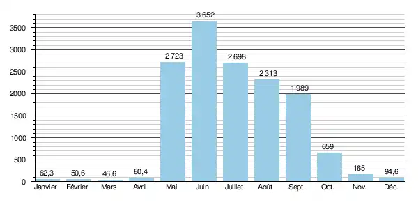 En considérant la seule période estivale, libre de glaces (de juin à octobre inclus), le débit mensuel minimal observé a été de 275 m3/s en , niveau restant encore bien confortable. Un débit mensuel estival inférieur à 280 m3/s est rare, voire exceptionnel.