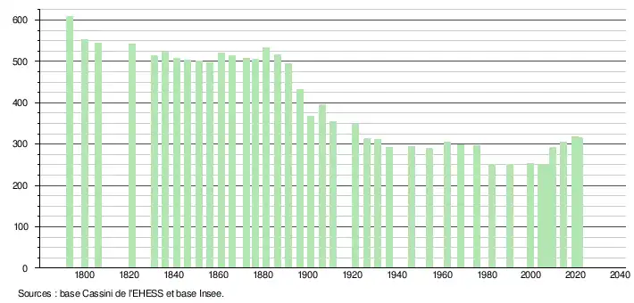 L'évolution du nombre d'habitants est connue à travers les recensements de la population effectués dans la commune depuis 1793. Pour les communes de moins de 10 000 habitants, une enquête de recensement portant sur toute la population est réalisée tous les cinq ans, les populations légales des années intermédiaires étant quant à elles estimées par interpolation ou extrapolation[22]. Pour la commune, le premier recensement exhaustif entrant dans le cadre du nouveau dispositif a été réalisé en 2004[23].