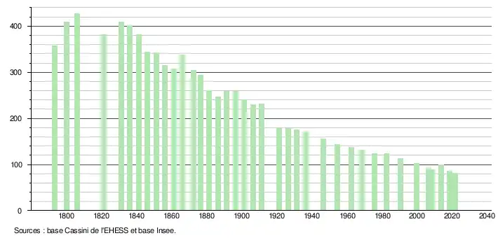 L'évolution du nombre d'habitants est connue à travers les recensements de la population effectués dans la commune depuis 1793. Pour les communes de moins de 10 000 habitants, une enquête de recensement portant sur toute la population est réalisée tous les cinq ans, les populations légales des années intermédiaires étant quant à elles estimées par interpolation ou extrapolation[14]. Pour la commune, le premier recensement exhaustif entrant dans le cadre du nouveau dispositif a été réalisé en 2008[15].