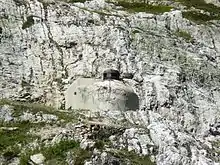 Répartition des blocs perchés sur le versant rocheux : à gauche (l'ouest) l'entrée, en haut la cloche du bloc 1, à droite (l'est) les casemates des blocs 3 et 2. | |||