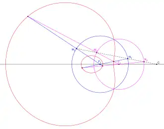 Chaque cercle (ΓM) est tangent à l'ovale en deux points TM et T'M toujours alignés avec le troisième foyer de l'ovale[17].