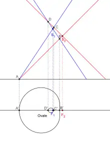 Michel Chasles[14] propose une construction d'ovale complet à l'aide de deux cercles de centres F1 et F2 et d'un point C situé sur la droite (F1F2). On fait pivoter une droite autour de C de telle sorte qu'elle rencontre le premier cercle en deux points M1 et N1 et le second cercle en M2 et N2. Les points de rencontre des droites (F1M1) et (F1N1) avec les droites (F2M2) et (F2N2) dessinent alors un ovale complet quand la droite pivote autour de C.