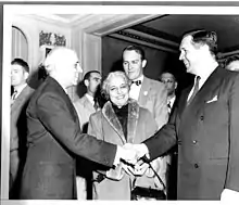 Jawaharlal Nehru (à gauche), Vijaya Lakshmi Pandit (au centre) et Frank Kelley (à droite) lors du déjeuner organisé par l’OPC, au Savoy-Plaza Hotel (en), le .