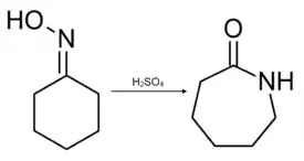 La principale réaction impliquant l'oxime de cyclohexanone est le réarrangement de Beckmann donnant l'ε-caprolactame :