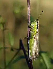 Ces criquets sont d'une tonalité générale verte, avec un pronotum orné d'une raie noire sur les côtés. l'abdomen est blanc-grisâtre. Le mâle est nettement plus petit que la femelle.