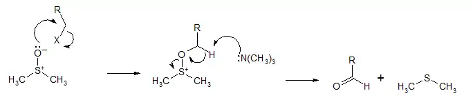 Comme toutes les oxydations à base de DMSO, l'oxydation de Kornblum crée un ion alcoxysulfonium qui, en présence d'une base, telle que la triéthylamine (Et3N), forme l'aldéhyde désiré.