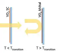 Parallèlement à la transition des propriétés électriques du VO2, l'augmentation de la température au-delà de 70 °C entraine aussi un fort changement de ses propriétés optiques : on parle de matériau thermochrome[21]. L'étendue de la modification de ses propriétés est plus importante dans le domaine du proche infrarouge (IR). Ainsi, dans l'IR, le matériau passe d'un comportement transparent dans son état semi-conducteur (phase M1) à un état absorbant et réfléchissant lorsqu'il devient métallique (phase R)[22].