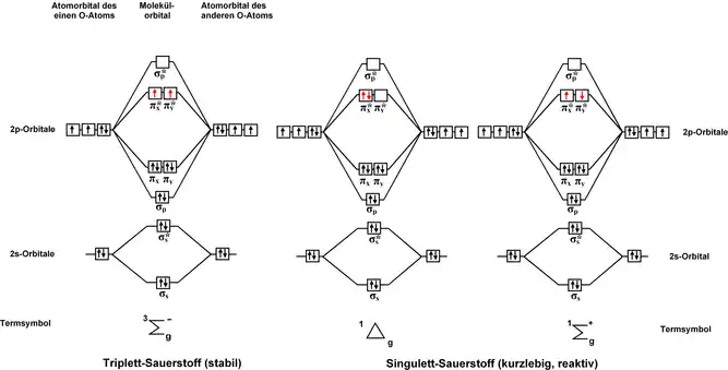 L'oxygène singulet se caractérise par une configuration électronique particulière, notée 1Δg, dans laquelle deux électrons de spins opposés () se trouvent sur une orbitale antiliante π*, alors que le dioxygène triplet — forme habituelle de l'oxygène — est noté 3Σg− et correspond à deux électrons de même spin () répartis entre deux orbitales π* et π*. Un second état instable existe, noté 1Σg+, qui diffère de l'état singulet 1Δg par le fait que les deux électrons de spins opposés () se répartissent sur deux orbitales π* différentes.