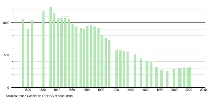 L'évolution du nombre d'habitants est connue à travers les recensements de la population effectués dans la commune depuis 1793. Pour les communes de moins de 10 000 habitants, une enquête de recensement portant sur toute la population est réalisée tous les cinq ans, les populations légales des années intermédiaires étant quant à elles estimées par interpolation ou extrapolation[16]. Pour la commune, le premier recensement exhaustif entrant dans le cadre du nouveau dispositif a été réalisé en 2008[17].
