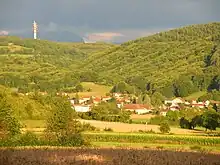 Le hameau du Haut Vernay et, au fond, le lac de Paladru. | |||||