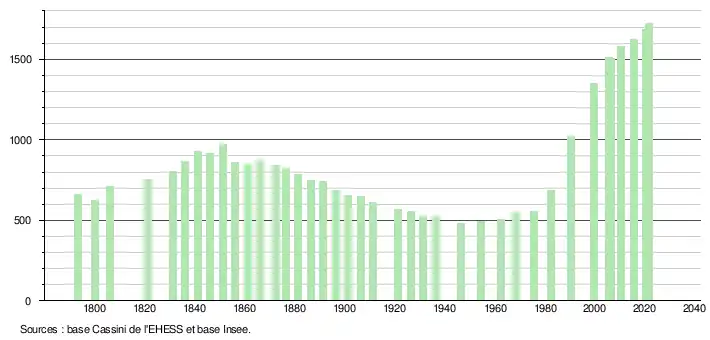 L'évolution du nombre d'habitants est connue à travers les recensements de la population effectués dans la commune depuis 1793. Pour les communes de moins de 10 000 habitants, une enquête de recensement portant sur toute la population est réalisée tous les cinq ans, les populations légales des années intermédiaires étant quant à elles estimées par interpolation ou extrapolation[16]. Pour la commune, le premier recensement exhaustif entrant dans le cadre du nouveau dispositif a été réalisé en 2005[17].