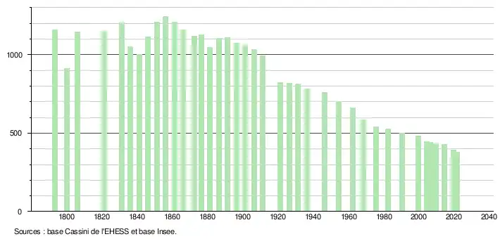 L'évolution du nombre d'habitants est connue à travers les recensements de la population effectués dans la commune depuis 1793. Pour les communes de moins de 10 000 habitants, une enquête de recensement portant sur toute la population est réalisée tous les cinq ans, les populations légales des années intermédiaires étant quant à elles estimées par interpolation ou extrapolation[15]. Pour la commune, le premier recensement exhaustif entrant dans le cadre du nouveau dispositif a été réalisé en 2004[16].