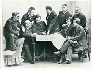 Le comité éditorial en 1893: Kasimir Leino, Reinhold Roine, Juhani Aho, Arvid Järnefelt, Erkki Reijonen, Santeri Ingman, E.O. Sjöberg, Eero Erkko et Filip Waren.