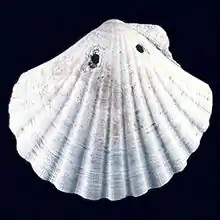 L'origine de la coquille de Saint-Jacques-de-Compostelle est probablement issue de cette symbolique antique mais renvoie aussi à plusieurs légendes compostellanes : cendres du saint arrivées à Compostelle dans une coquille ; saint Jacques au moment où passait le bateau ramenant sa sépulture de Jérusalem, sauve des flots tumultueux un prince que son cheval emballé y avait précipité. Sur le point de périr, le cavalier invoque l'aide du saint, et bientôt son corps se trouve miraculeusement repêché, tout constellé de coquilles[6].