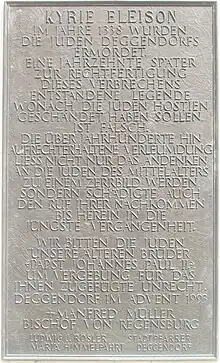 - « Kyrie Eleison. En 1338, les juifs de Deggendorf ont été assassinés. Pour justifier ce crime une légende est née une dizaine d’années plus tard, selon laquelle les Juifs auraient profané des hosties. Entretenue pendant des siècles, cette calomnie n'a pas seulement créé une image déformée des Juifs du Moyen Âge, mais a entaché aussi la réputation de leurs descendants jusque dans le passé le plus récent. Nous demandons pardon aux Juifs, « nos frères ainés » (pape Jean-Paul II), pour l'injustice qui leur a été faite. Deggendorf, pendant l'Avent 1993. Manfred Müller, évêque de Ratisbonne. Ludwig J. Rösler, curé de l’église de l’Assomption à Deggendorf[4].