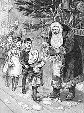Le père Noël tel que nous le connaissons aujourd'hui est issu d'un triple mouvement en profondeur, l’américanisation, l’uniformisation et la déchristianisation[14]. Il est popularisé dans la deuxième moitié du XIXe siècle aux États-Unis, nation d’immigrants, en majorité de protestants qui rapportent avec eux les traditions européennes et les légendes des pays froids, leurs rennes, leurs lutins et leurs sapins[15]. Il prend le nom ouvertement germanique de Santa Claus, directement inspiré du Saint Nicolas de la Flandre zélandaise.