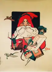 Santa vêtu de mauve sur un traîneau tiré par des lutins (vers 1900).