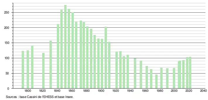 L'évolution du nombre d'habitants est connue à travers les recensements de la population effectués dans la commune depuis 1793. Pour les communes de moins de 10 000 habitants, une enquête de recensement portant sur toute la population est réalisée tous les cinq ans, les populations légales des années intermédiaires étant quant à elles estimées par interpolation ou extrapolation[26]. Pour la commune, le premier recensement exhaustif entrant dans le cadre du nouveau dispositif a été réalisé en 2007[27].