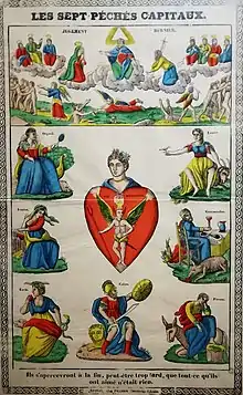 Les sept péchés capitaux ont été une source d'inspiration inépuisable pour les artistes tout au long du Moyen Âge et à la Renaissance. On les trouve dans la sculpture et les peintures qui ornent les églises[13]. On les trouve par exemple sur les chapiteaux des colonnes du Palais des Doges de Venise, sur les fresques de Giotto di Bondone (1267-1337), pour la chapelle des Scrovegni de Padoue, (ca. 1305-1306).