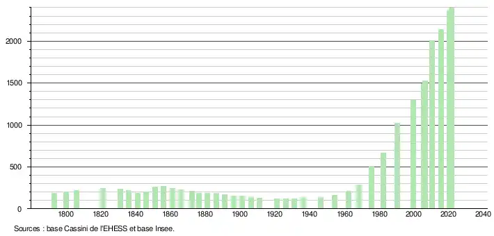 L'évolution du nombre d'habitants est connue à travers les recensements de la population effectués dans la commune depuis 1793. Pour les communes de moins de 10 000 habitants, une enquête de recensement portant sur toute la population est réalisée tous les cinq ans, les populations légales des années intermédiaires étant quant à elles estimées par interpolation ou extrapolation[32]. Pour la commune, le premier recensement exhaustif entrant dans le cadre du nouveau dispositif a été réalisé en 2005[33].
