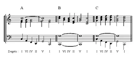 - Le plus souvent, la note de la pédale est soit la tonique (exemple A), soit la dominante (exemple C). Lorsque ces deux degrés sont entendus simultanément, on parle de double pédale (exemple B).