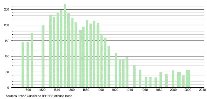 L'évolution du nombre d'habitants est connue à travers les recensements de la population effectués dans la commune depuis 1793. Pour les communes de moins de 10 000 habitants, une enquête de recensement portant sur toute la population est réalisée tous les cinq ans, les populations légales des années intermédiaires étant quant à elles estimées par interpolation ou extrapolation[30]. Pour la commune, le premier recensement exhaustif entrant dans le cadre du nouveau dispositif a été réalisé en 2008[31].