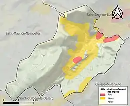 La commune est vulnérable au risque de mouvements de terrains constitué principalement du retrait-gonflement des sols argileux[23]. Cet aléa est susceptible d'engendrer des dommages importants aux bâtiments en cas d’alternance de périodes de sécheresse et de pluie. 26,2 % de la superficie communale est en aléa moyen ou fort (59,3 % au niveau départemental et 48,5 % au niveau national). Sur les 80 bâtiments dénombrés sur la commune en 2019, 32 sont en aléa moyen ou fort, soit 40 %, à comparer aux 85 % au niveau départemental et 54 % au niveau national. Une cartographie de l'exposition du territoire national au retrait gonflement des sols argileux est disponible sur le site du BRGM[24],[Carte 2].