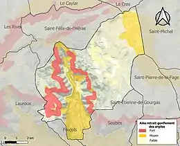 La commune est vulnérable au risque de mouvements de terrains constitué principalement du retrait-gonflement des sols argileux[25]. Cet aléa est susceptible d'engendrer des dommages importants aux bâtiments en cas d’alternance de périodes de sécheresse et de pluie. 38,1 % de la superficie communale est en aléa moyen ou fort (59,3 % au niveau départemental et 48,5 % au niveau national). Sur les 140 bâtiments dénombrés sur la commune en 2019, 134 sont en aléa moyen ou fort, soit 96 %, à comparer aux 85 % au niveau départemental et 54 % au niveau national. Une cartographie de l'exposition du territoire national au retrait gonflement des sols argileux est disponible sur le site du BRGM[26],[Carte 2].