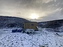 Plusieurs cabanes[23] ont été installées en différents sites de la péninsule Courbet pour abriter les équipements et les opérateurs des programmes de recherche scientifique, d'abord en géophysique (Molloy[C 1], Pointe Suzanne[C 2]), puis en hydrobiologie (Studer[C 3], Limnigraphe[C 4]) et en écologie des populations (Pointe du Morne[C 5], Estacade [C 6], cap Ratmanoff[C 7], cap Cotter[C 8], cap Noir[C 9], Cataractes[C 10], rivière du Nord[C 11]). Enfin, celle de Port-Raymond[C 12] et celle de la rivière des Manchots[C 13] ont été installées pour l'accueil touristique et celle de chez Jacky[C 4] (remplaçant celle du Limnigraphe) pour la détente des hivernants[24].